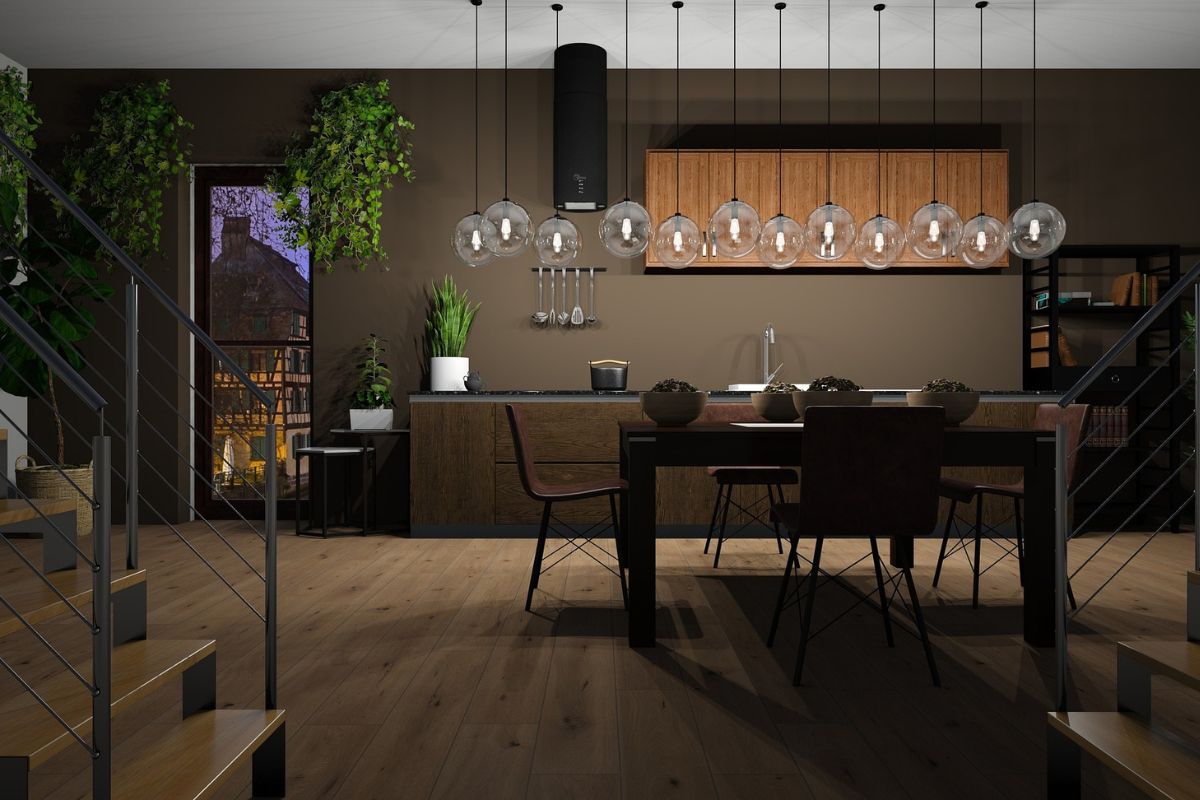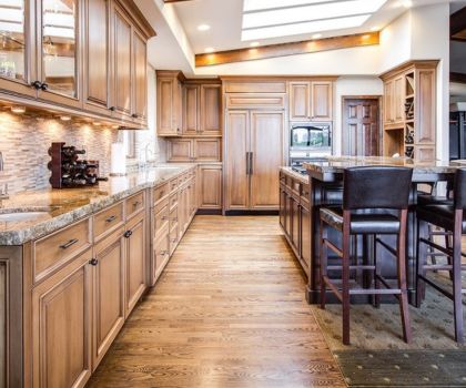 A kitchen designed with a warm wooden theme, featuring natural wood cabinetry and accents that create a cozy, rustic atmosphere.