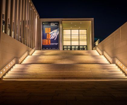 A commercial shop with a striking entrance, featuring long stairs illuminated by yellowish dim aesthetic lights along the sides, creating an inviting and stylish ambiance.
